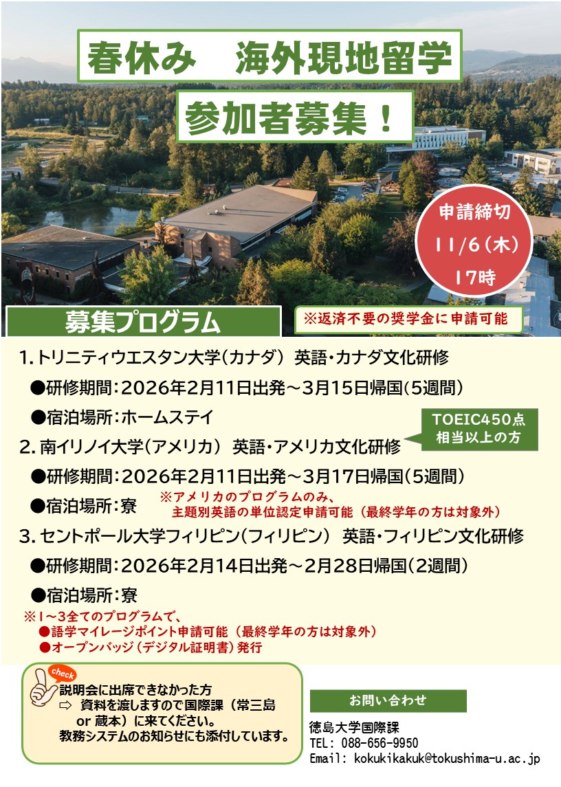 詳細は、教務システムの「お知らせ」の「留学生・留学」のカテゴリに掲載していますので、ご確認ください。