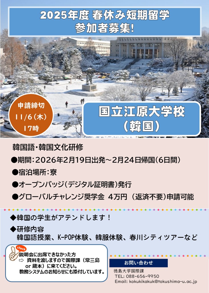春休みに実施する韓国への短期留学参加者を募集しています。