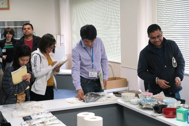 | 説明を受ける新入留学生 | 日用品の配付 |