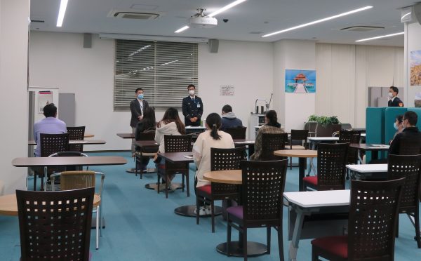 On Wednesday, November 10, 2021, the International Affairs Division and International Office conducted a fire drill training for international students at the Glocal-Communication Hall, Tokushima University. Among 16 participants, eight students are currently residing at the Kitajima International House and Nichia Kaikan, and eight students have joined online from overseas.