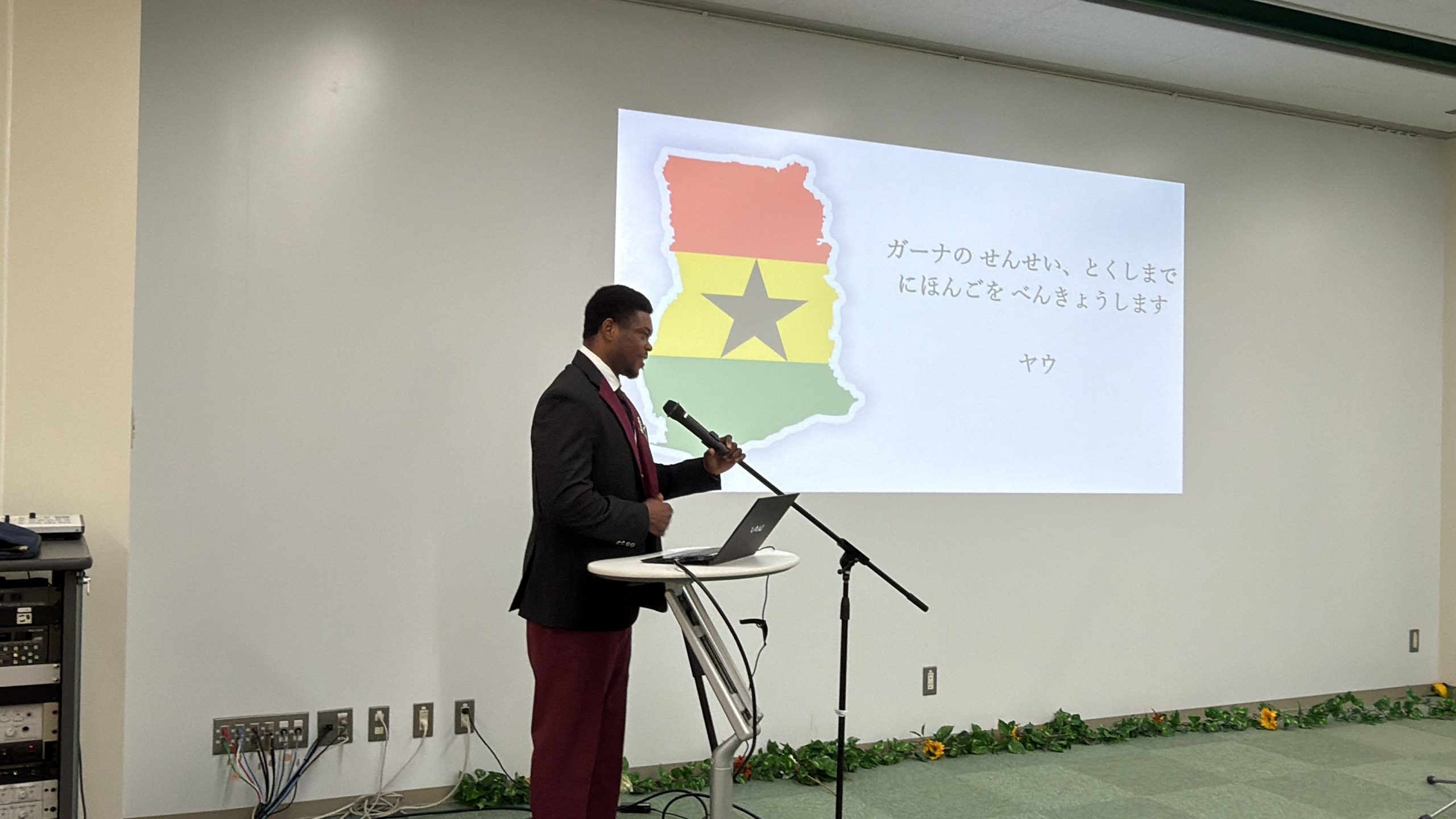 At the ceremony, eight international students—two each from Ghana, Bangladesh, one each from Malawi, Pakistan, Malaysia, and Mongolia —delivered speeches in Japanese, marking the culmination of six months of study. Each student used PowerPoint slides to present in Japanese about their home country, research fields, experiences in Japanese classes, and future aspirations.