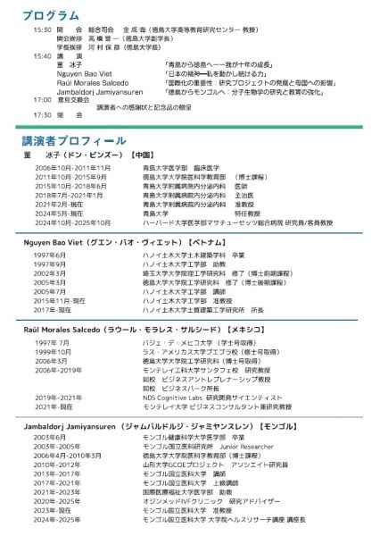 本シンポジウムは、本学を卒業・修了し、研究者、教育者、実業家等として活躍されている元留学生を招聘し、現在のお仕事の内容や本学での留学経験がどのように活かされているか等についてご講演いただくものです。