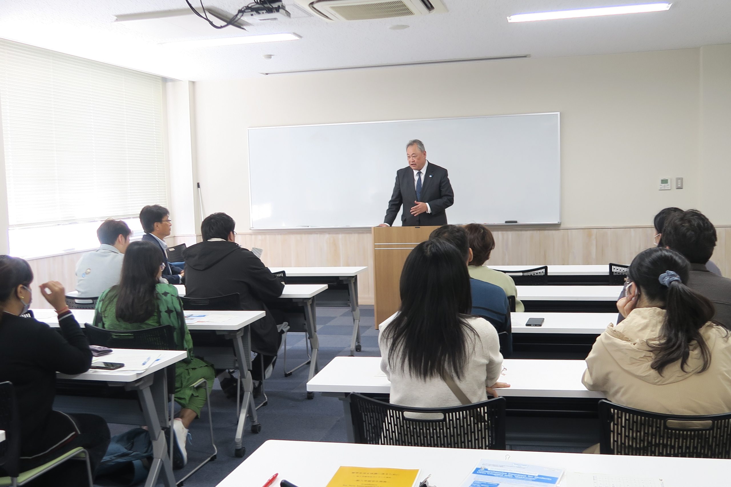 当日は、安澤国際センター長の挨拶に続き、国際センター教員より、就職、防災、交通安全、日本での生活ルール、在留資格などについて説明がありました。留学生たちは熱心に耳を傾けていました。