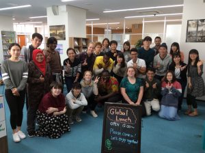 Global Lunchは、徳島大学の外国人留学生と日本人学生がランチを食べながら英語・日本語をはじめとする多言語で交流する場です。2018年度後期には10月から1月までの毎週木曜日の昼休みに、地域創生・国際交流会館1階多言語交流コモンラウンジにおいて開催し、計12回のGlobal Lunchに延べ283名の学生が参加しました。中国、韓国、カナダ、カンボジア、フランス、ドイツ、インド、インドネシア、フィリピン、バングラデシュ、ラトビアなどからの外国人留学生と日本人学生が、大学生活について質問し合ったり、互いの文化を紹介したりしました。Global Lunchでは、日本人学生・外国人留学生が所属・研究分野・国籍を超えて友人としてつながり、双方の文化を学び合う場を目指しています。